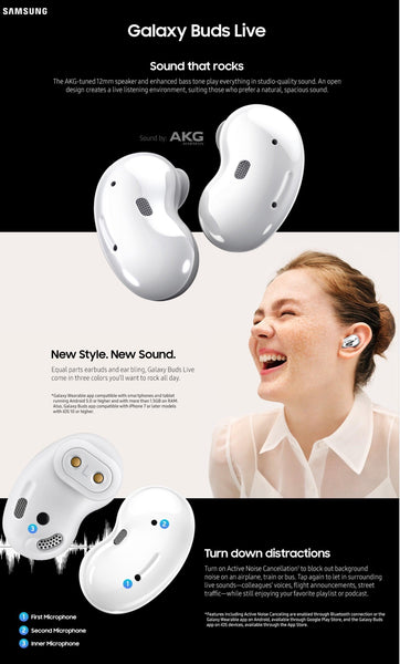 Hear every sound come alive. 12mm speakers with sound by AKG work together with Galaxy Buds Live's ergonomic design to deliver spacious sound, while the large driver and bass duct help emit deep bass with air flow that lets sound flow seamlessly.
